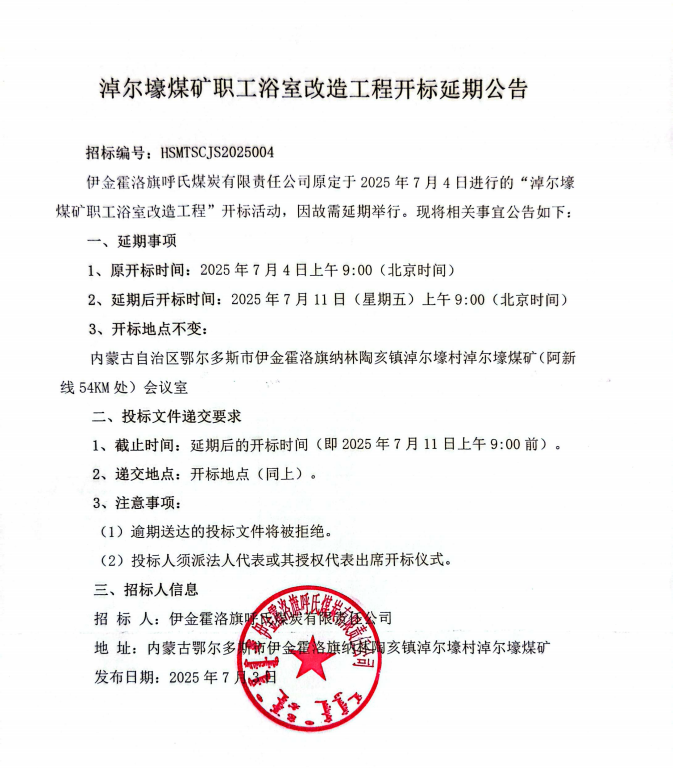 淖尔壕煤矿职工浴室改造工程开标延期公告